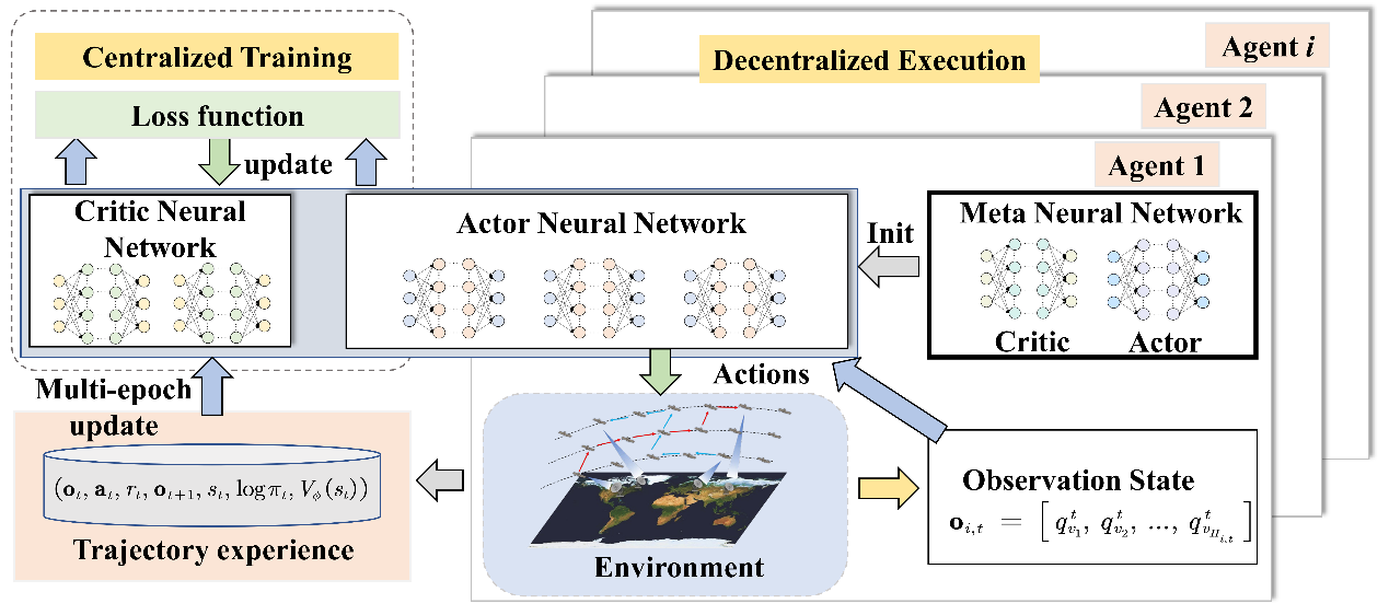 研究团队围绕动态卫星网络环境下长距离复杂端到端路径选择与时延优化问题展开系统研究,针对现有路由方法在低轨卫星网络中面临的网络链路拥塞波动、策略收敛速度慢等关键挑战,在多智能体强化学习框架中首次引入元学习思想,提出了一种基于元强化学习的多智能体近端策略优化(Meta-MAPPO)的多路径选择方法。该方法将星地融合网络中的多源多目的通信问题建模为分布式部分可观测马尔可夫决策过程,并顺利获得跨任务经验共享学习具有良好泛化能力的策略初始化,使算法能够在新的网络场景中实现快速适应与稳定优化。在算法设计上,研究第一时间基于K最短路径算法生成候选路由集合,并结合链路队列长度、传输时延等网络状态构建局部观测,顺利获得联合考虑端到端时延与链路拥塞程度的奖励函数,引导智能体实现低时延与负载均衡的路径选择策略。仿真实验结果表明,在96颗卫星组成的Walker星座网络场景下,所提出方法相比传统路由算法和其他强化学习方法在平均端到端时延方面至少降低5%,并在不同服务时间条件下保持零丢包率,同时显著提升策略收敛速度,展现出良好的稳定性与适应能力。