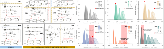 结果表明, 在工业化评估体系下,SR2 和 SR3 路径具有显著的负碳足迹(分别为 -14.3 tCO₂eq/t 和 -13.4 tCO₂eq/t),最低的生产成本(约 0.32×10⁴ - 0.33×10⁴ CNY/t),以及良好的能源效率(>40%)。研究还发现,干重整预处理虽然增加了部分公用工程成本,但能高效地将温室气体 CH₄ 和 CO₂ 转化为可利用的合成气(CO/H₂),极大地提升了碳减排效益。此外,碳税政策将大幅增强 SR2/SR3 的经济竞争力,预计可降低其净生产成本达 31%-40% 和 28%-39%,使其未来应用潜力巨大。相比之下,SR1(已工业化路线)的碳足迹和经济性较差,SR4、SR5 和 SR6 路径或因原料成本高、或因碳效率/能源效率问题,在工业规模下缺乏综合竞争力。