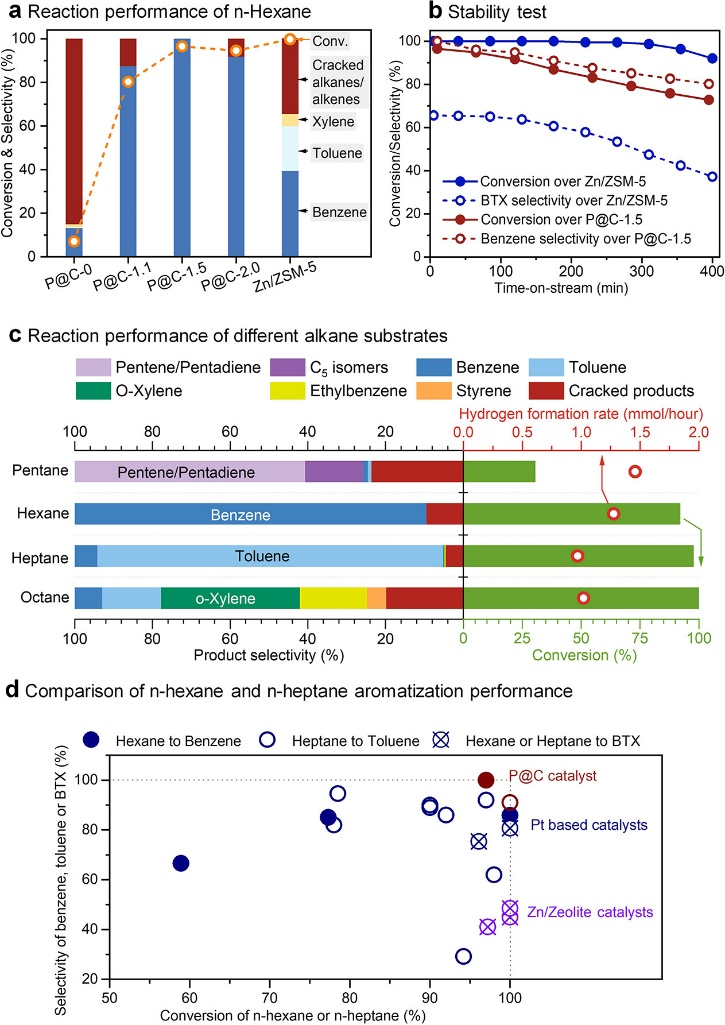 该团队联合北京大学王蒙副研究员,提出并系统开展了一种磷掺杂碳(P@C)非金属催化体系,成功实现 C6-C8正构烷烃的无受体脱氢芳构化,将正构烷烃定向转化为对应芳烃,并同步生成氢气,实现芳烃与氢气的协同制备。相关成果以“Highly selective dehydroaromatization of n-alkanes to aromatics and hydrogen gas”为题发表在《Journal of the American Chemical Society》。