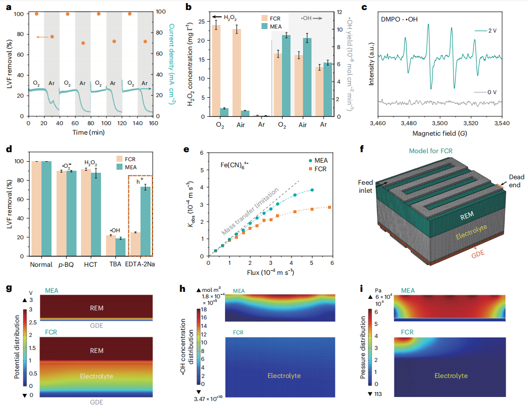 针对这一问题,研究团队创新性地将气体扩散电极与电化学活性膜电极相结合,组装了膜电极组件(MEA)水处理系统,实现了阴极氧还原反应和阳极氧化反应的耦合增效。中国科研实验室上海高等研究院的研究团队在本工作中,特别是在理论计算与模拟方面给予了关键支撑。顺利获得多物理场模拟,清晰揭示了MEA系统中电位分布、活性物质浓度场(如HO₂⁻和·OH)及流体压力场的变化规律,从理论上阐明了该装置相对于传统流动池反应器(FCR)在传质效率、反应动力学和电流密度方面的优越性,为器件设计与性能优化给予了重要理论依据。